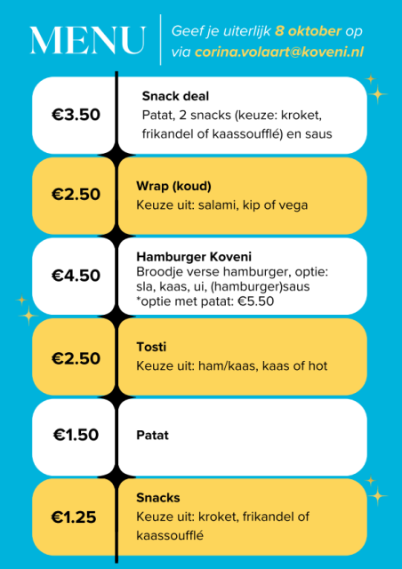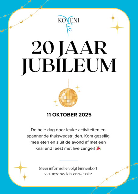Op 1 oktober bestaat Koveni alweer 20 jaar! Op zaterdag 11 oktober gaan we dit vieren. In de nieuwsbrief van het bestuur van afgelopen juli is er ook al een save-the date langsgekomen. De komende weken zal er meer informatie volgen, dus houdt onze website, Instagram en flyers in de kantine in de gaten om niets te missen en geef je vast op voor het eten!