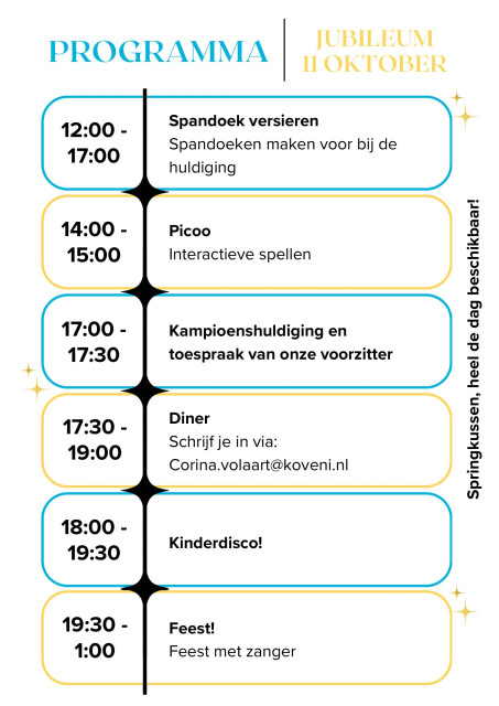 Op 1 oktober bestaat Koveni alweer 20 jaar! Op zaterdag 11 oktober gaan we dit vieren. In de nieuwsbrief van het bestuur van afgelopen juli is er ook al een save-the date langsgekomen. De komende weken zal er meer informatie volgen, dus houdt onze website, Instagram en flyers in de kantine in de gaten om niets te missen en geef je vast op voor het eten!